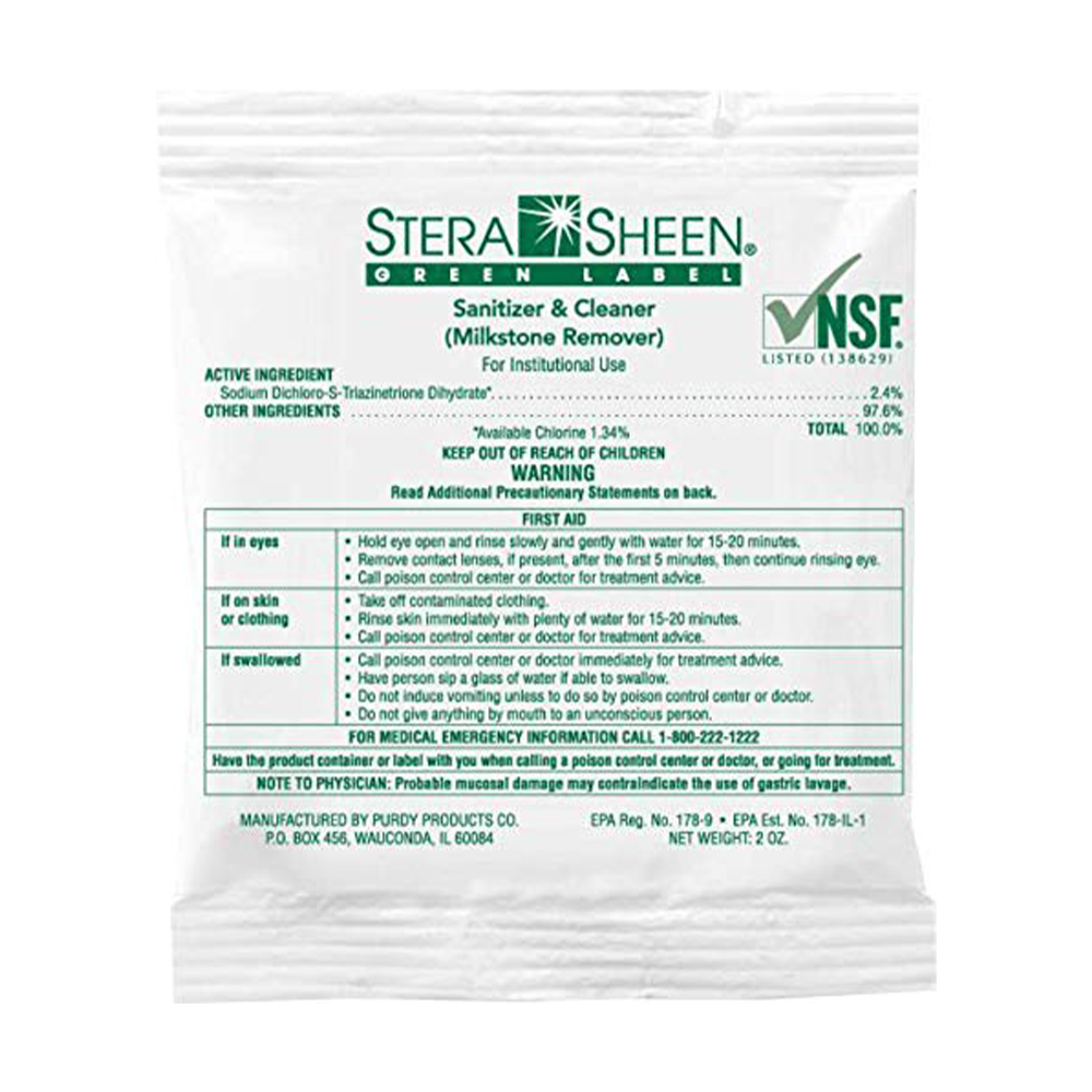 Stera Sheen Green Label Sanitizer and Cleaner – A Multi-functional food grade cleaner: cleans ice cream machines, batch freeezers, cappuccino machines, iced tea dispensers, smoothie blenders, dispense systems and more. Safe for all food contact surfaces.